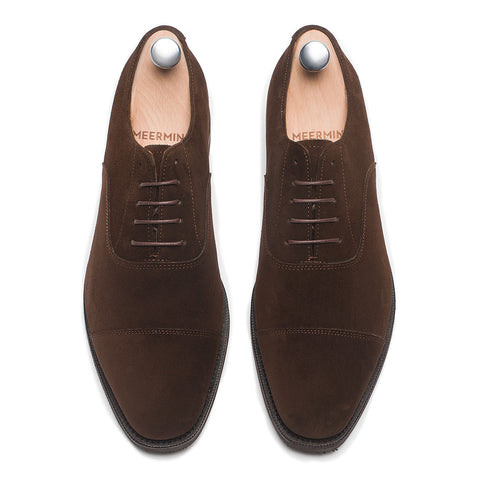 Introducing a new interpretation of our cap toe Oxford — designed to deliver exceptional comfort without compromising classic elegance. This version is crafted from Brown Superbuck suede by the renowned Charles F. Stead tannery in England, prized for its compact nap, velvety texture, and durability. The suede lends the shoe a relaxed yet refined character, making it equally suited for both smart and casual settings.